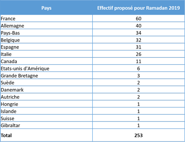Pour Ramadan 2019, la délégation compte 253 membres répartis en Europe et en Amérique du Nord dans les pays suivants :